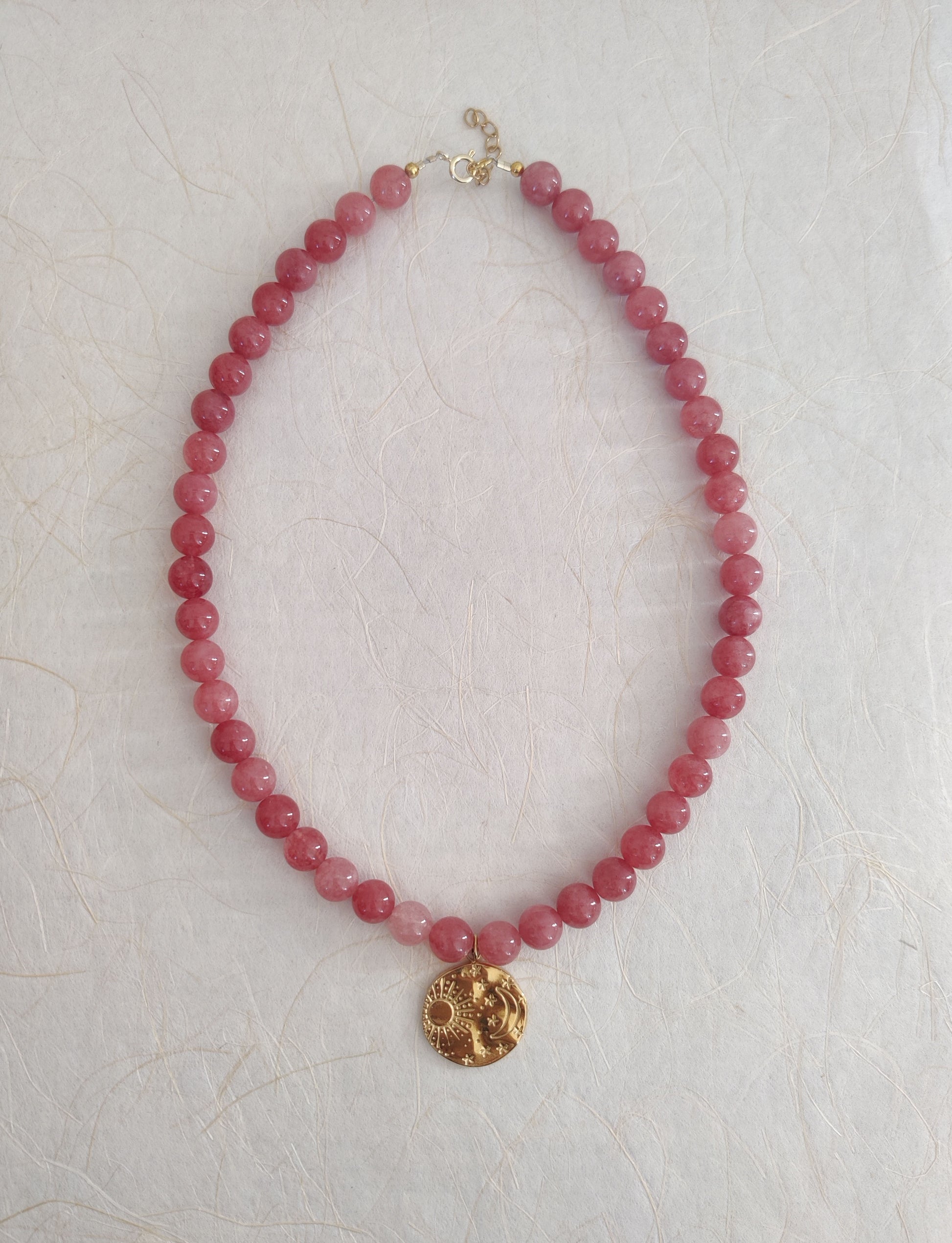 Pink sunstone 8mm natural stone beads with 14K gold plated disc pendant